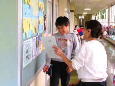 各学級では、4月から昨日までの「がんばったこと(学習等の成果)」や「できるようになったこと(成長のあしあと)」等が記載されている通知表が、担任の先生から一人一人にあてて、直接丁寧な説明も含めながら手渡されておりました。