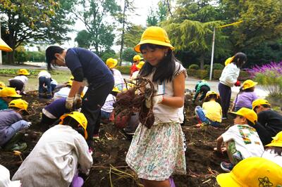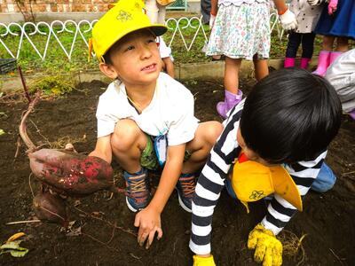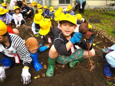 5月の種いも植えから数えて約半年。その間、暑い日も欠かさず水をやり、雑草を抜いて大切に育てたサツマイモでしたが、本日みんなで「おいも掘り」を行い、たくさん収穫することができました!