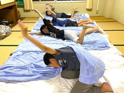※「大貫を表現して!」という無茶なお願いにも、笑顔で「いいッスよ!」と言ってポーズを作ってくれたみなさん。 布団シーツを海に見立てて泳ぎ始めたみなさんは素晴らしいです! ありがとう!笑