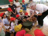 郷土資料館から二名のベーゴマ名人の先生をお迎えし、回す練習→ひもまきの説明をおききしました。名人同志の対決では、ベーゴマから火花が散っている様子におどろきの声をあげていました。