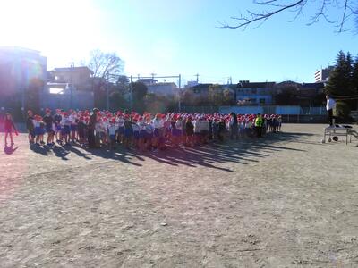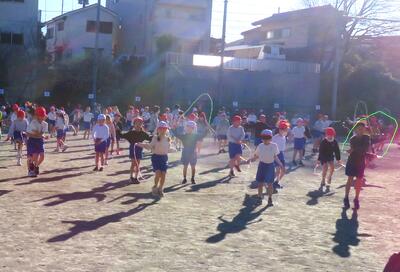 全校で校庭に集まり、音楽のリズムのあわせて、みんなで縄とびを行いました!