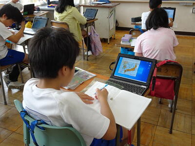 社会科で、日本の国土について学習しています。今日は日本とその周辺の国、海を詳しく見てみました。タブレットに映された資料から読み取って、分かったことをノートに一所懸命書くことができました!
