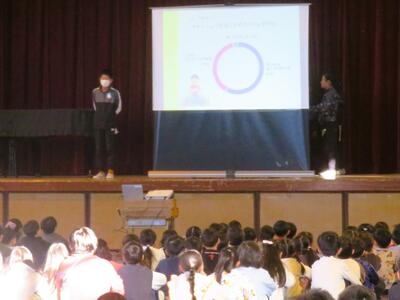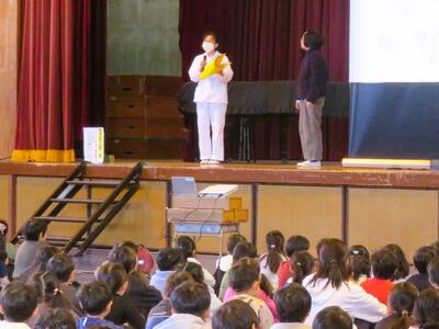 前半は、給食に関するアンケート調査の結果等を発表し、本校の実態と「バランスよく食べることの大切さ」について、全校のみなさんに呼びかけておりました。
