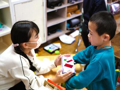 各ブースでは、担当の2年生たちが、1年生に優しく声をかけたり、手とり足とり丁寧に遊び方を教えてあげる姿が、とても微笑ましかったです!