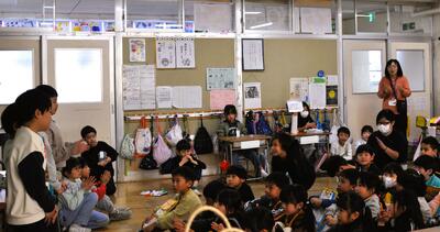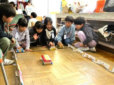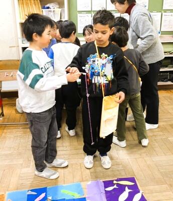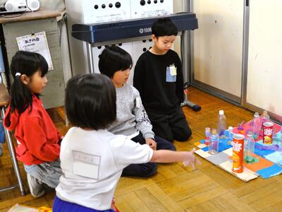 2年生が、生活科の学習で1年生を招待し、自分たちで作成した様々なおもちゃ等を使って、一緒に遊びました。