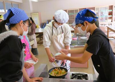 家庭科担当の先生に加えて、栄養士の先生にもご協力いただき、安全に、楽しく、そして、より一層美味しくなるように教わりながら、どちらのクラスでも皆で協力して、楽しく実習を行いました!