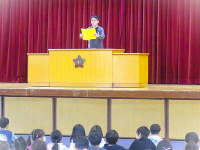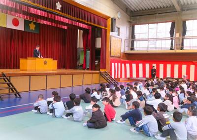 校長先生からは、この一年間の頑張りや成果について褒めていただくと共に、春休み中は、事件事故には十分に気をつけつつ、進級への準備とすること等のお話をいただきました。 続いて、代表児童からは、この一年間の思い出を振り返りつつ、できるようになったことや来年度の目標などについて、前向きで立派なお話がありました。